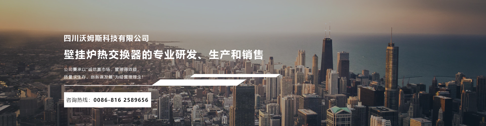 四川沃姆斯科技有限公司座落于環境優美的中國科技城----四川省綿陽市。 公司成立于2006年,是一家從事壁掛爐熱交換器的專業研發、生產和銷售的生產廠家。經過9年發展,匯集了一批擁有行業領先技術和豐富應用經驗的優秀人才。現代化的生產設備,先進的生產技術工藝及各種精密的檢測設備,我們擁有年產量高達100萬臺的生產能力,能急客戶之所急,想客戶之所想,在市場中贏得客戶的一致認可。 公司秉承以“誠信贏市場,管理得效益,質量求生存,創新謀發展”為經營理理念!憑借高質量的產品,完善的售后服務,良好的信譽,贏得市場! ...